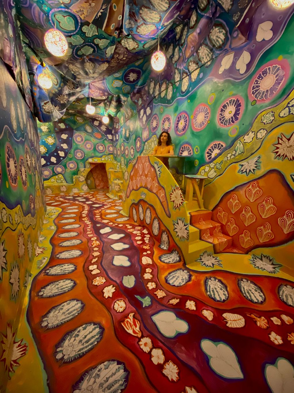 water based paints, screen printed drawings on paper and fabric, wood furnature, handmade lighting, 14 x 18 x 30 ft
