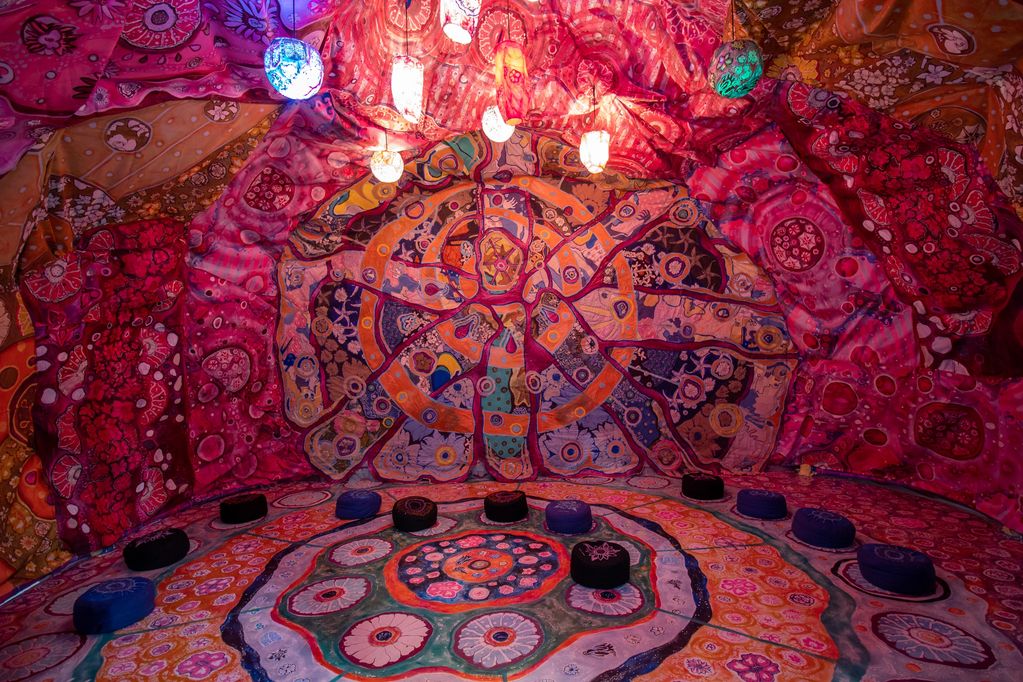 water based paints, screen printed drawings, and hand sewing on muslin, resins, and handmade lights and printed meditaiton cushions, 16 x 14 x 14 ft