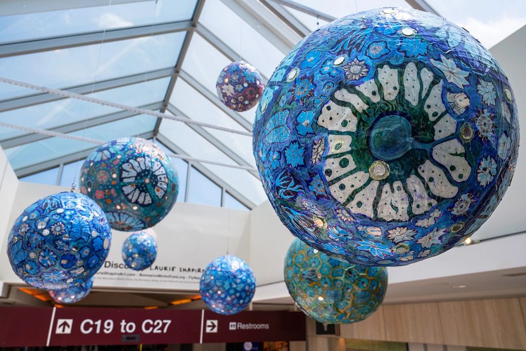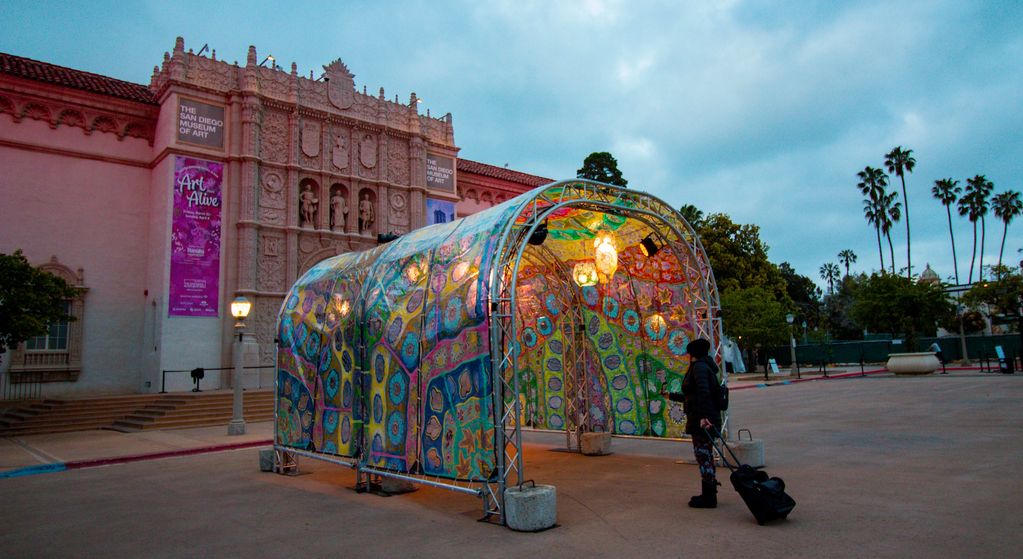 water based paints and screen printed drawings on vinyl over metal truss and handmade lighting, 12 x 12 x 18 ft